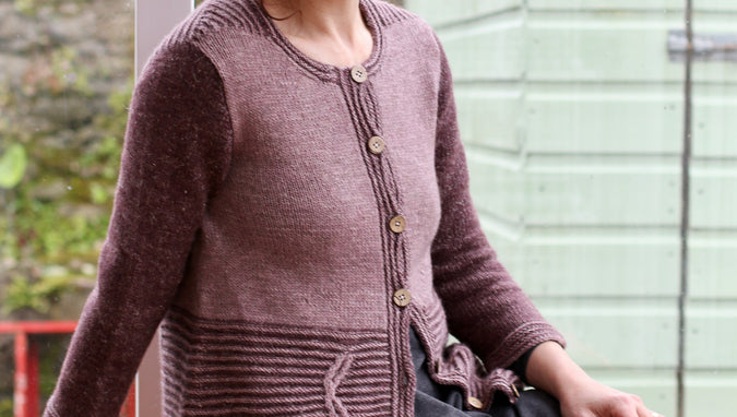 This cardigan starts from the top with a small double garter stitch triangular saddle on each shoulder. From there you will work the front and back separately until you reach the underarm where it joins together for the body. Below the bust, you’ll begin working in Double Garter Stitch again and some cables are introduced as well. Finally, the sleeves are picked up around the armhole where we will use short rows to create a seamless set-in sleeve.