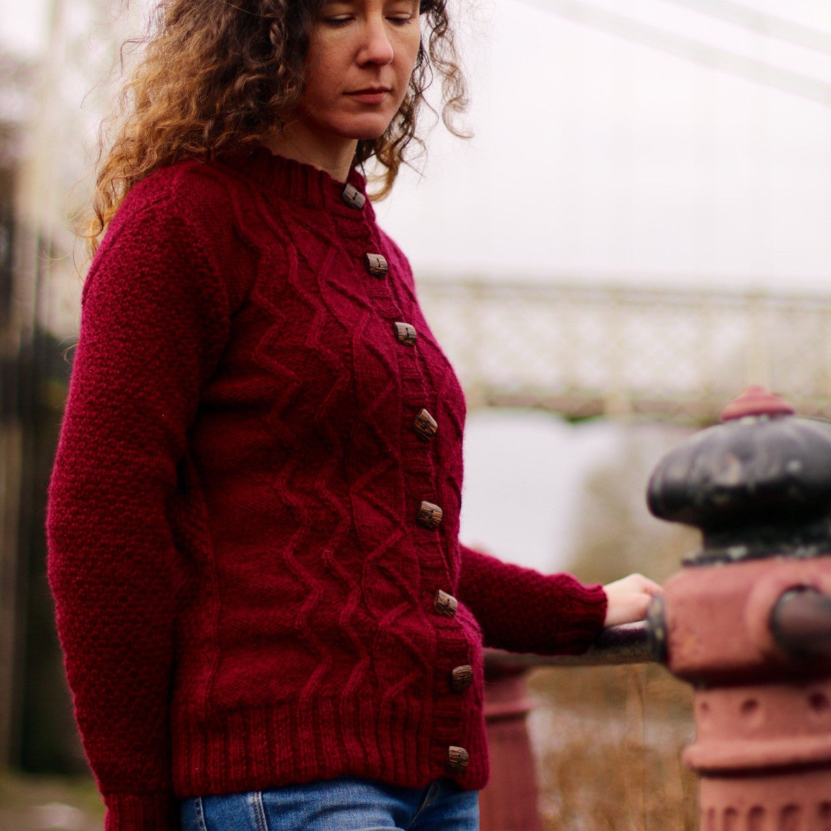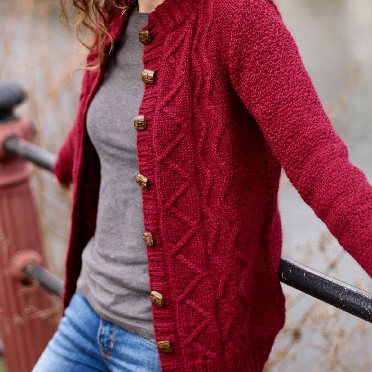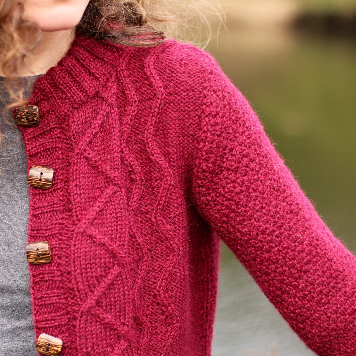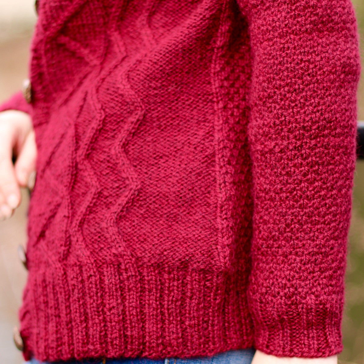 A little sprinkling of geometric cables and the lovely texture of dot stitch make this cardigan wonderful to wear. Knit in one piece from the bottom up, it has waist shaping, shaped armholes and set-in sleeves worked using short rows from the top down.
