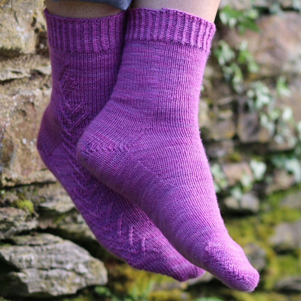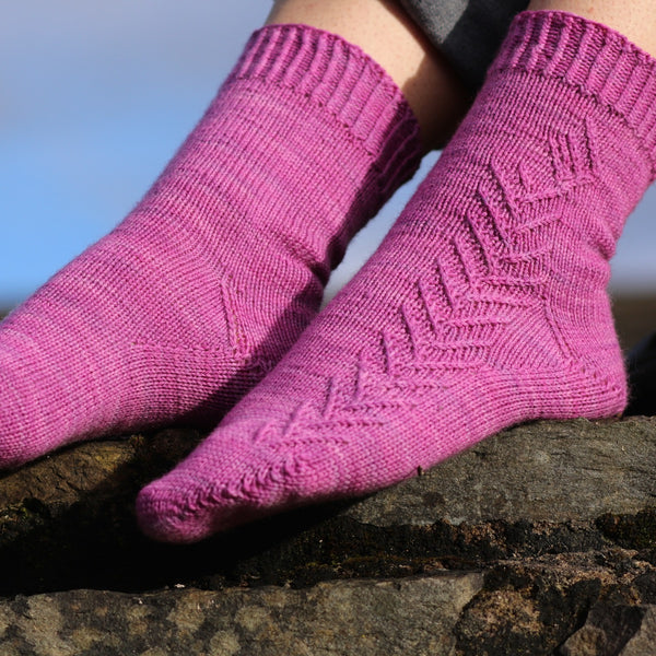 A delicately patterned sock that uses short rows to create the toe and heel.