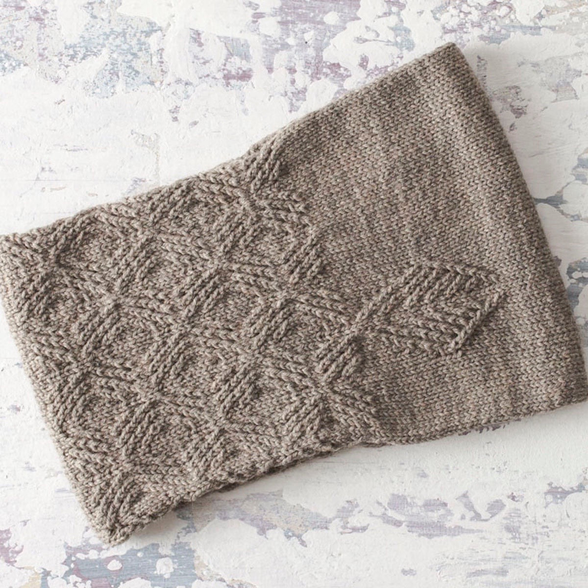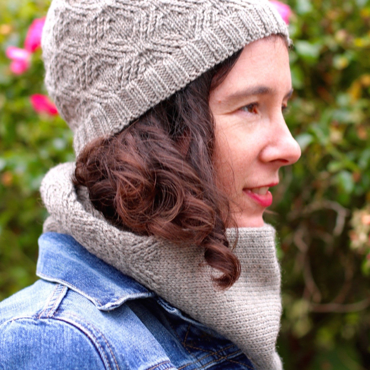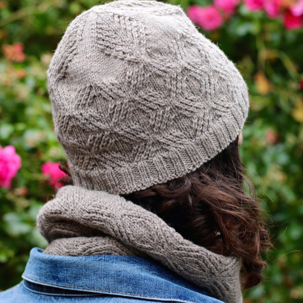 Small lattice cables create a beautiful texture in this warm cowl and hat set.