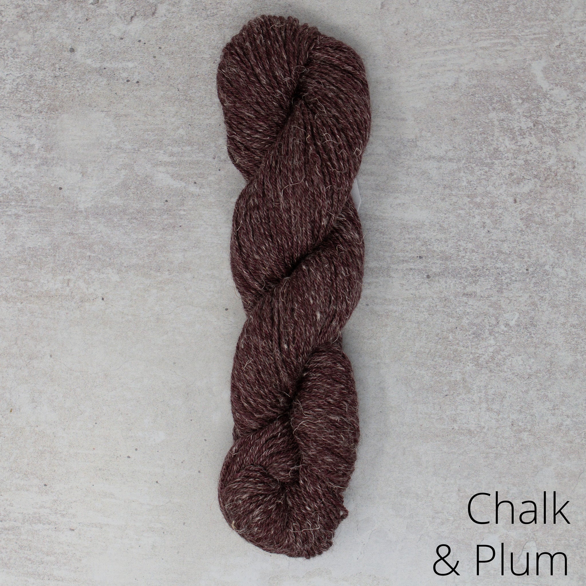 Stolen Stitches 'Nua Worsted' (60% Merino, 20% Yak, 20% Linen; 109 yds / 100 m per 1.76 oz / 50 g); colour: Chalk and Plum (9907); 7 (8, 8, 9, 9, 9, 10, 11, 11, 12) skeins for sweater, 5 (6, 6, 7, 7, 7, 8, 8, 9, 9) skeins for vest