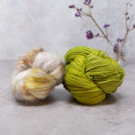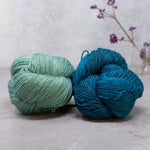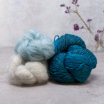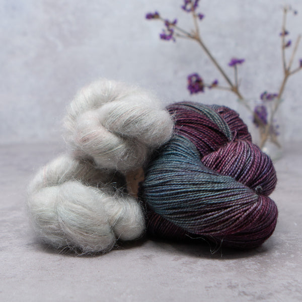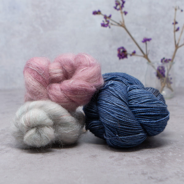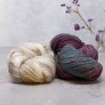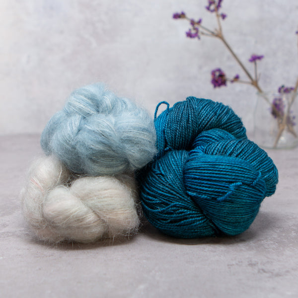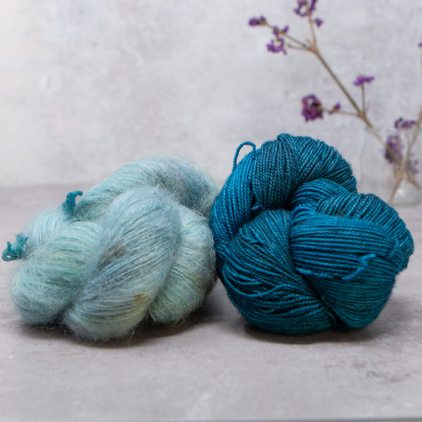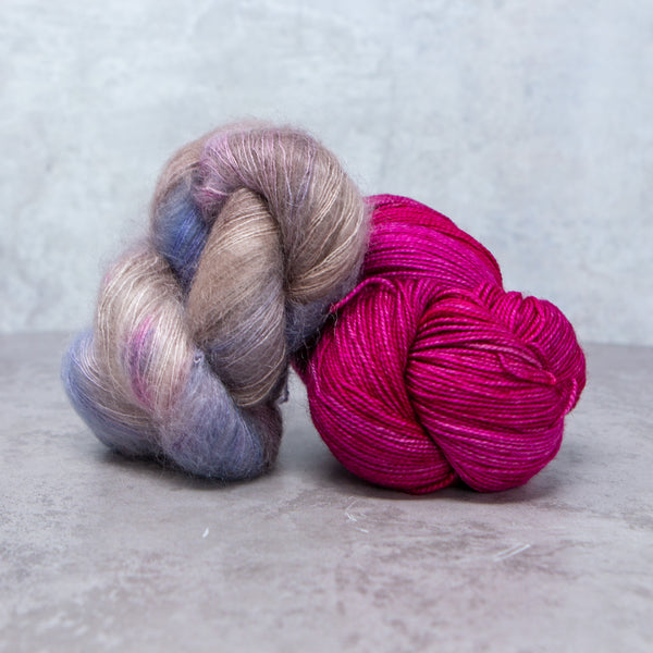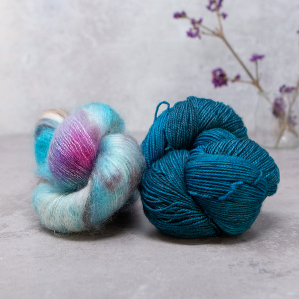 Choose from over 20 combinations; pair Vivacious 4ply with your choice of contrast colour. You can either use 2 smaller contrast colours or one single skein that is larger. We have 4 contrast options, Manos del Uruguay 'Cabrito', LITLG 'Haze Lace', Cowgirl Blues 'Kidsilk' or Fyberspates 'Gleem Lace'.