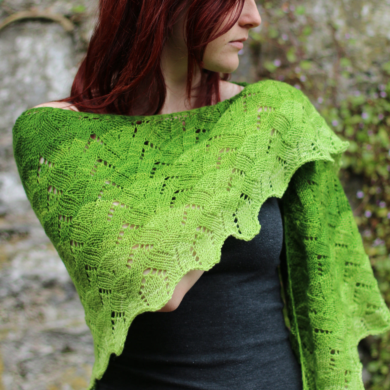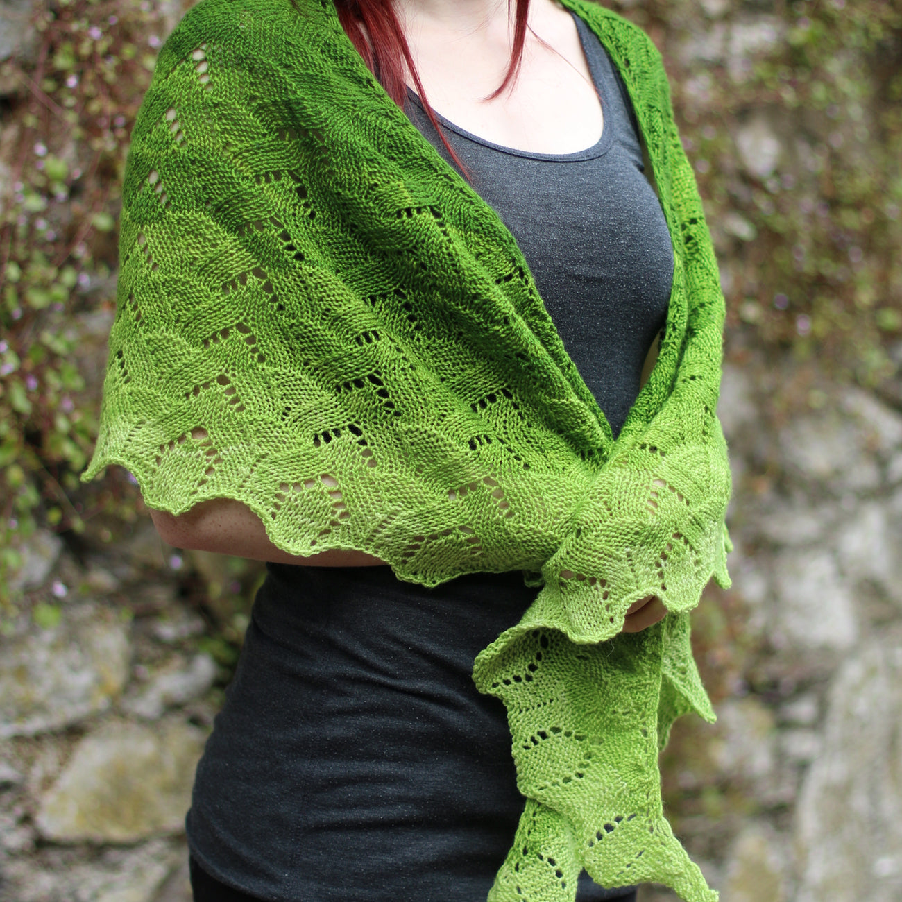 This shawl is worked from the top down in a wide crescent shape. Work begins with a biased textured pattern that transitions into a lace pattern. The gradient yarns in the sample move smoothly from one colour to the next so the shawl feels like a continuous colour gradient. This would also make it ideal for a single continuous colour gradient yarn also.