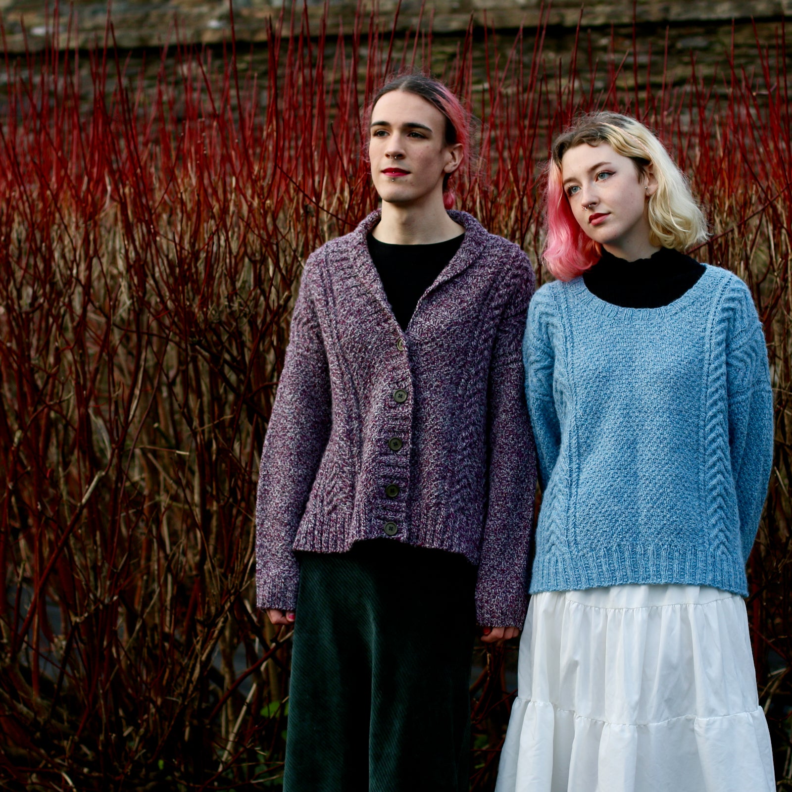 Learn to knit the Dalia cardigan and sweater in this combined project workshop. Delight in textured stitches and staghorn cables with both garments worked from the top down.