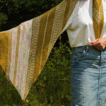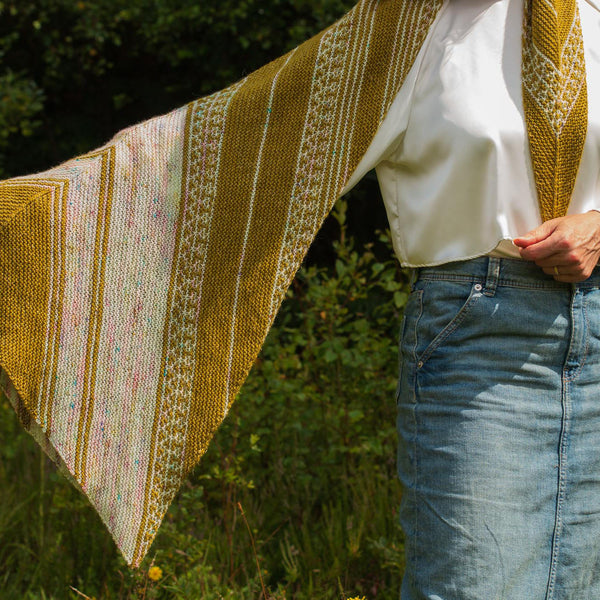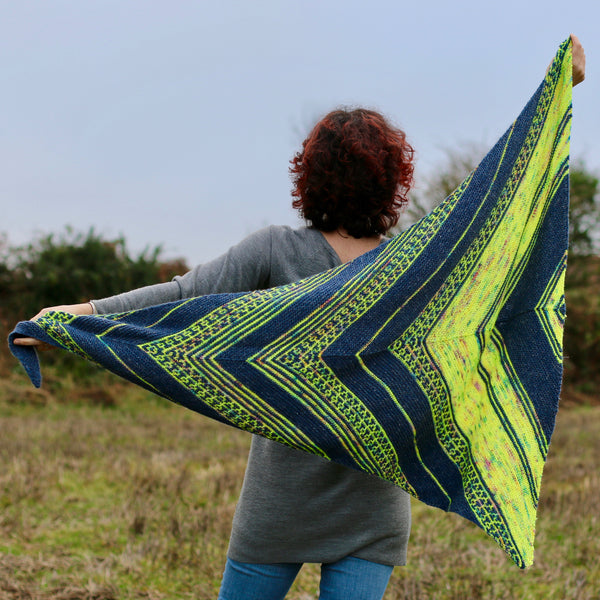 This shawl starts at the very tip and increases out to the widest point creating a chevron in garter and mosaic pattern stripes by using increases and decreases.