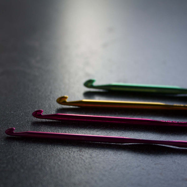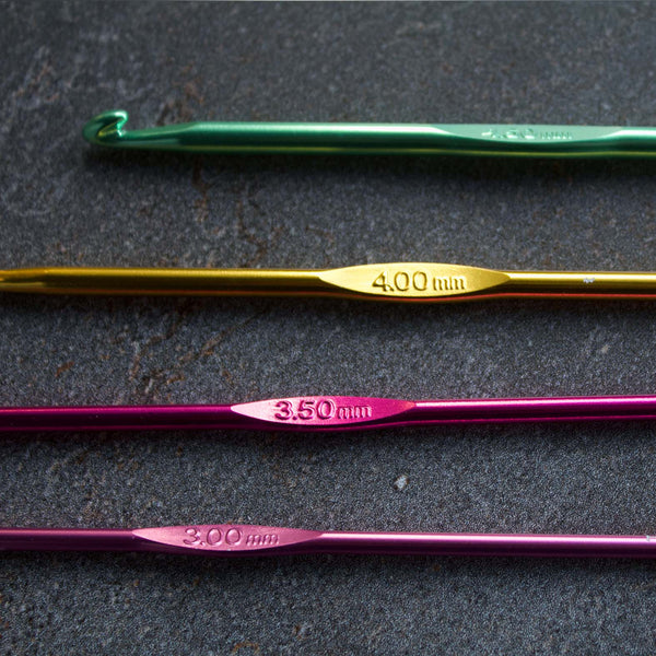 These colourful aluminum crochet hooks are smooth and lightweight, making them a pleasure to crochet with. Sizes are shown in mm.