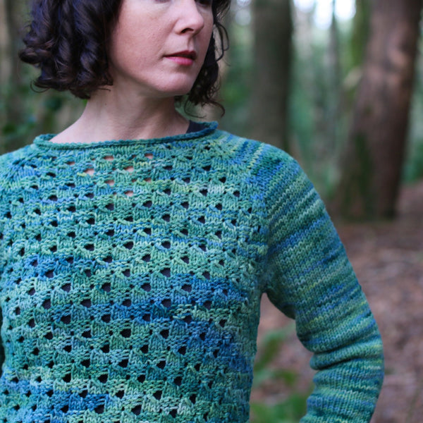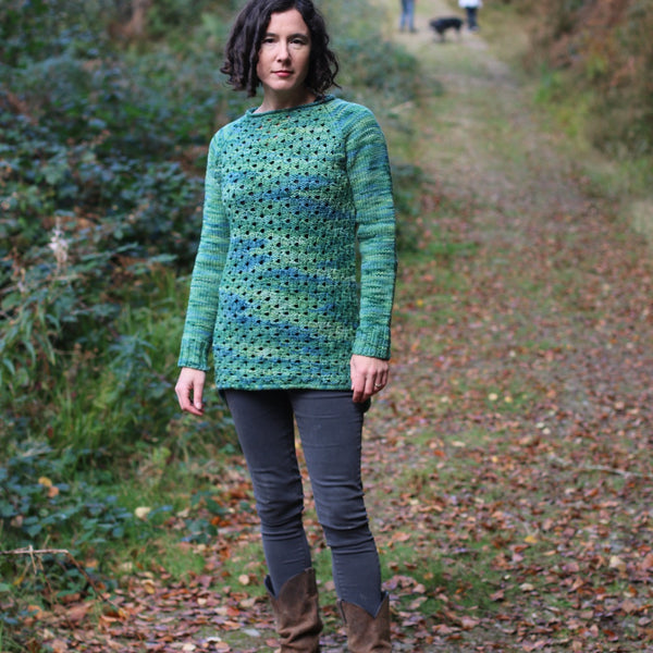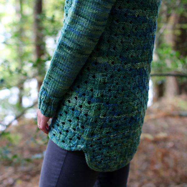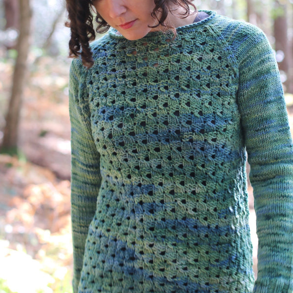 Texture, subtle lace and a nice long body give this sweater its unique look. Knit in the round from the bottom up the textured lace pattern creates a lighter feel with heavy yarn. The split hem, raglan shoulder shaping and crew neck will make this sweater a winter favourite.