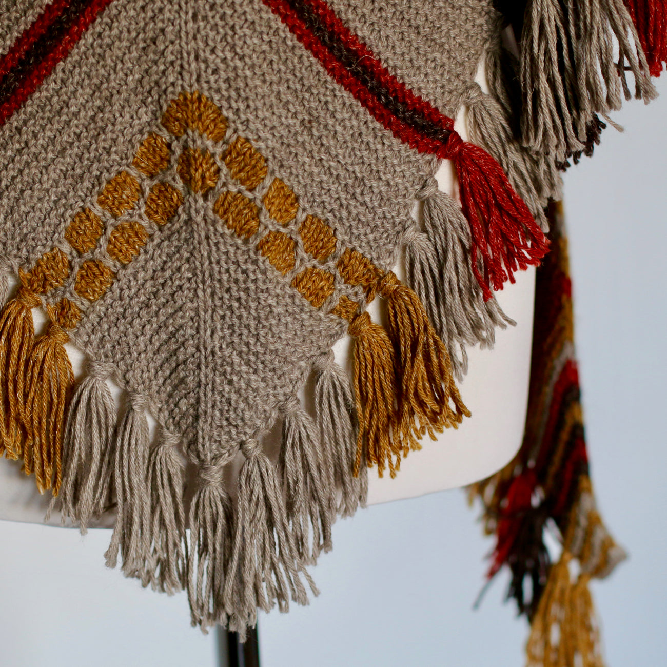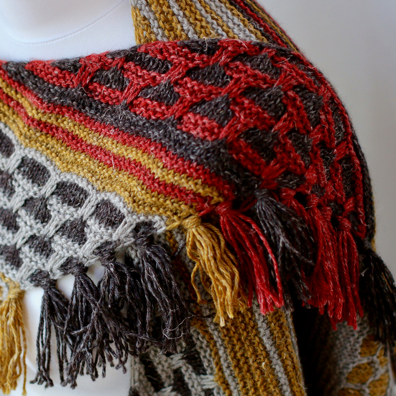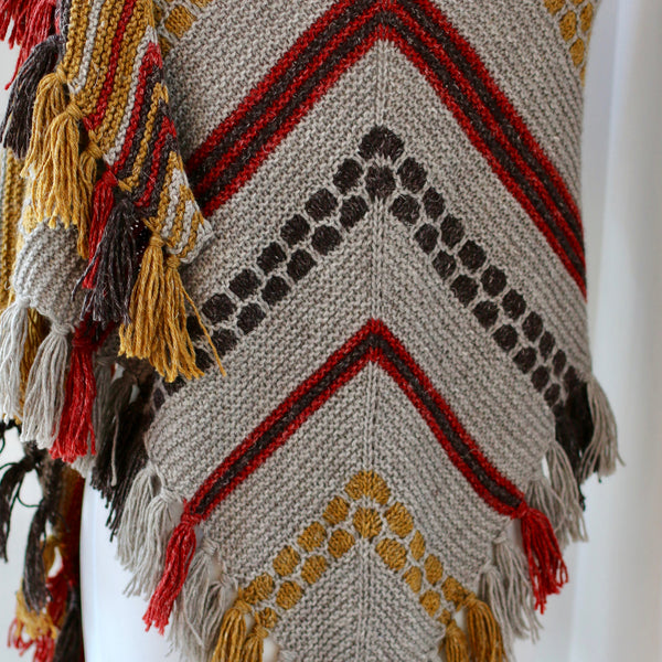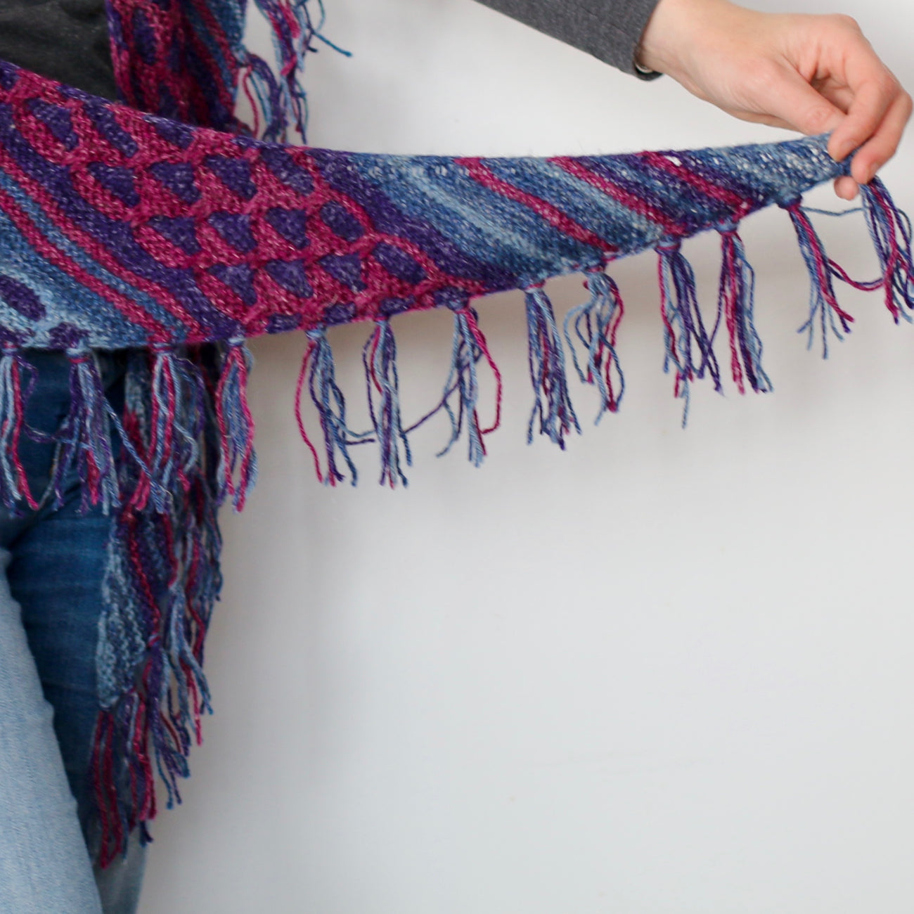 This yardage is for shawl only. Use remains of skeins for optional fringe. Fringe as shown used 26 g of yarn; 80 yds / 73 m of yarn in total in a variety of colours.
