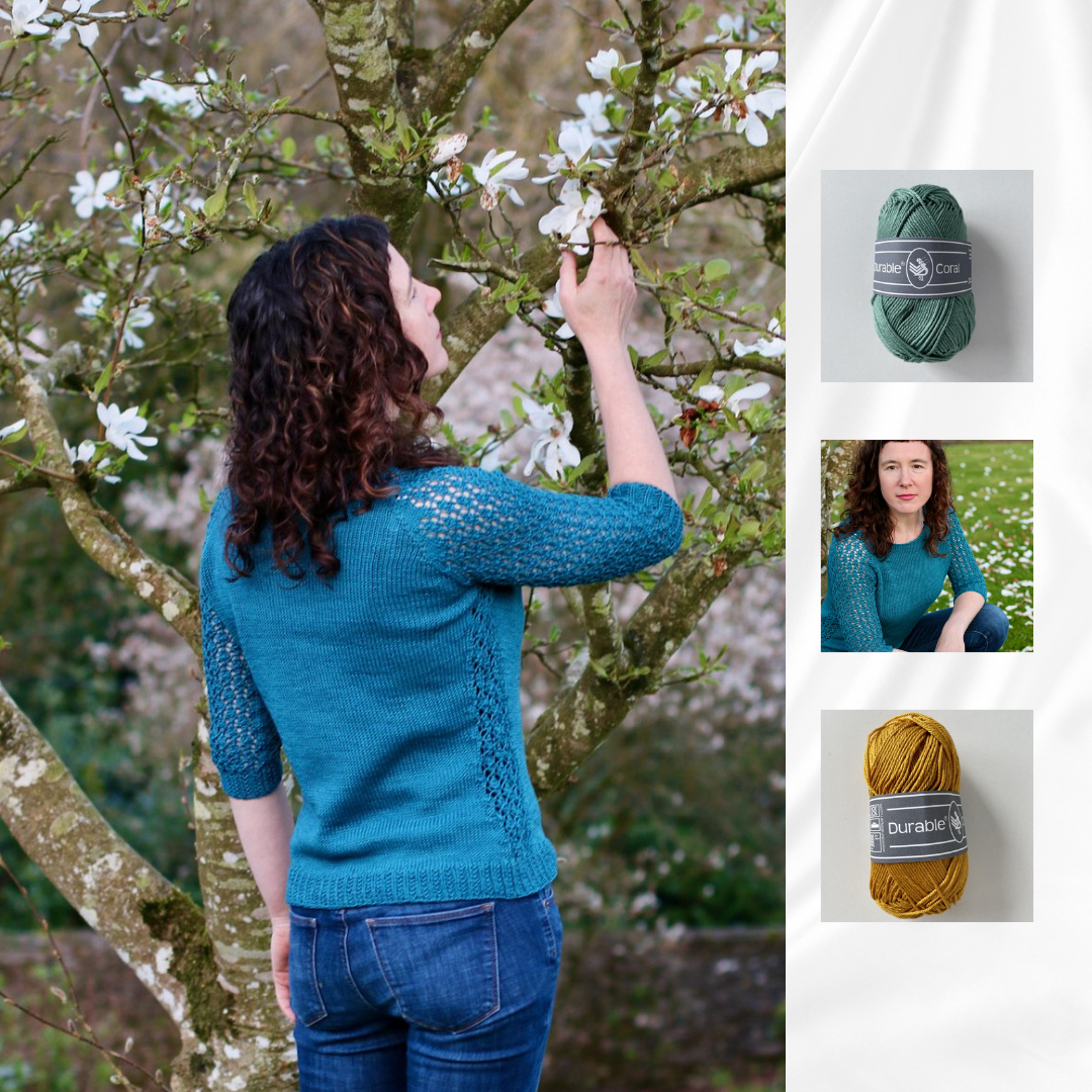 Knit from the top down with raglan shaping this sweater has a delicate lace pattern flowing down the sleeves in contrast to the simple knit body. Gentle waist shaping and ¾ length sleeves make this an easy and elegant sweater to wear.