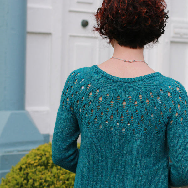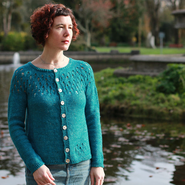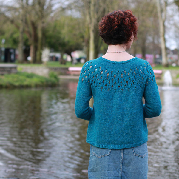Stolen Stitches ‘Nua Sport’ (60% Merino, 20% Yak, 20% Linen, 153 yds / 140 m per 1.8 oz / 50 g); colour: Hatter’s Teal Party (9803), 7 (7, 8, 8, 9, 9, 10, 10, 11, 11) skeins