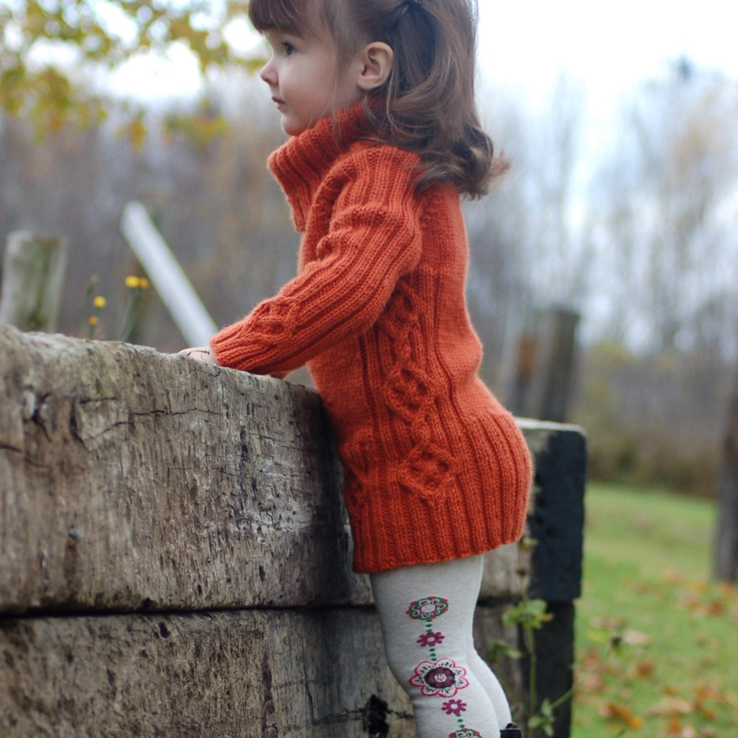 Keep your little one cosy in this long cabled sweater with a cosy cowl.
