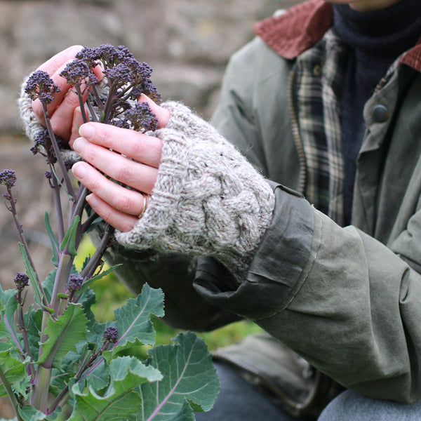 Embrace the joy of frosty winter walks and late season harvests all wrapped up in the cabled Inis Beg hat and mitts set.