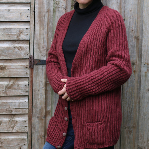 There are a large range of suggested sizes that this cardigan will fit. Choose the way you want it to fit, with a small amount of positive ease or very oversized, it’ll look great both ways! We have shown it modelled with both a medium and large amount of ease.