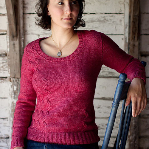 This classic, elegant sweater features delicate intertwining cables, waist shaping and a deep scoop neck. Knit seamlessly from the bottom up with top down set-in seamless sleeves.