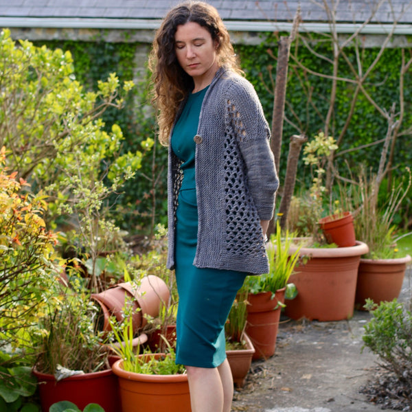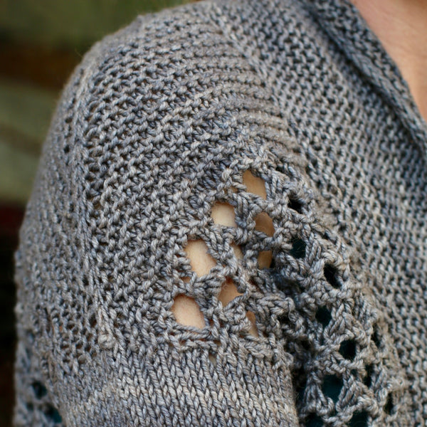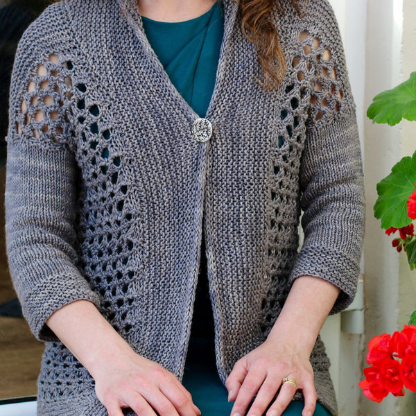 Dramatic over-sized lace creates a fast to knit, airy cardigan perfect for spring and summer. The garter stitch edging anchors the cardigan together for a light, comfortable fit. Knit flat from the bottom up in one piece, German short rows shape the garter stitch shoulder slopes. Sleeves are worked in the round from the top down once the body is complete.