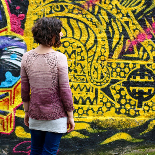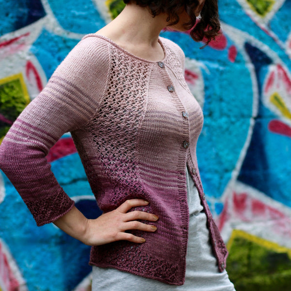 Knit from the top down, this delicate lace cardigan has wide lace panels that travel from the neck down the length of the cardigan.  There are 2 yarn options given; either a gradient version where the yarn color moves from light to dark, creating a lovely ombre or a single colour version in Nua.