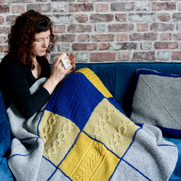 Knit this glorious blanket to keep you cosy all winter long. Knit as a series of cabled squares in the centre surrounded by garter squares, making it a portable project.