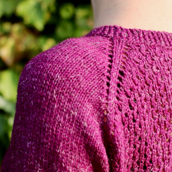 This light airy cardigan is the perfect finish for your summer outfit. It is knit from the top down using raglan shoulder shaping and a gentle v-neck. The buttonband is integrated so when you bind off the cardigan the only finishing you will have is to sew on the buttons!