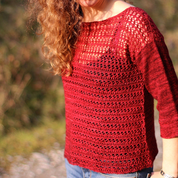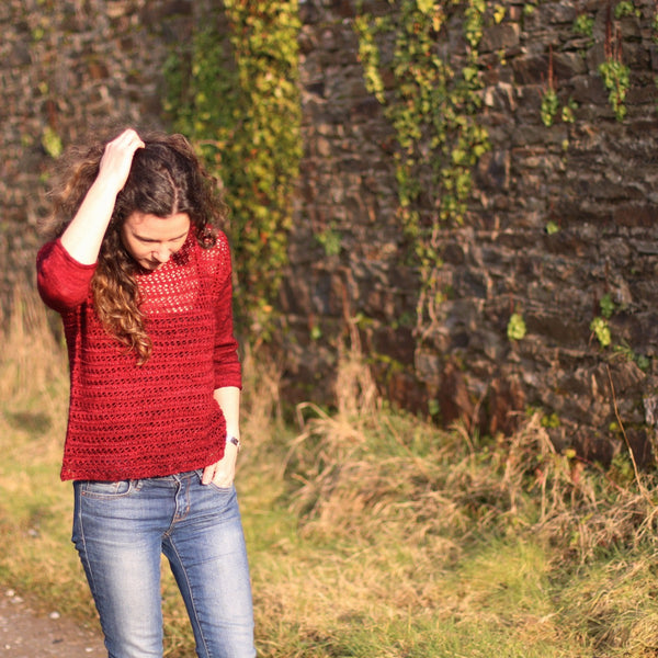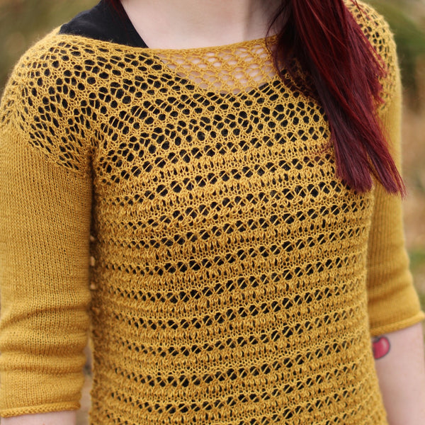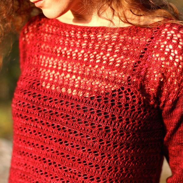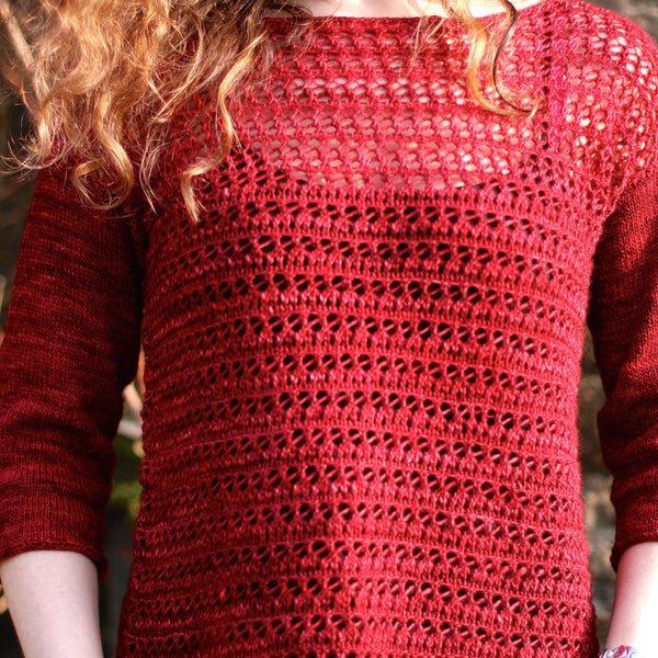 Knit in the round from the bottom up, the body splits at the yoke and the front and back are worked separately. Sleeves are picked up from the armhole and worked in the round to the cuff.