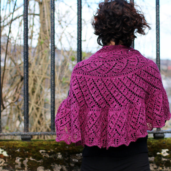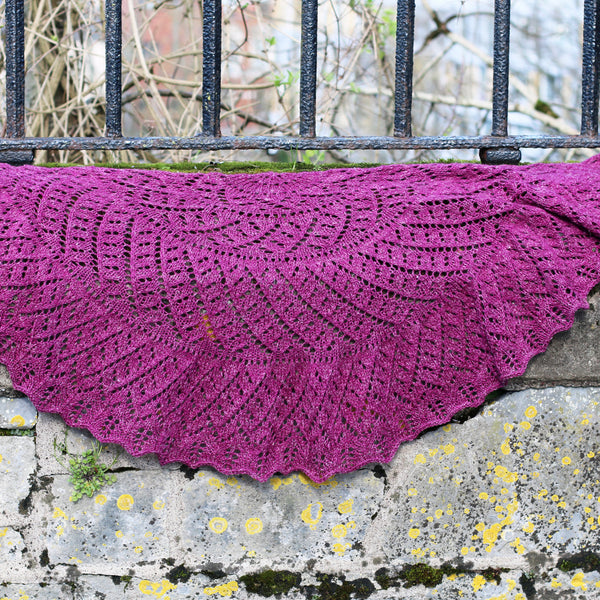 This semi-circular shawl is knit from the neck down with increase rows becoming spaced further apart as you move down the shawl.