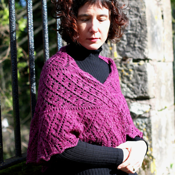 Shown in two sizes, unusually the smaller size is knit using heavier dk yarn and larger needles and the larger version uses fingering weight yarn and smaller needles. Suggestions are given in the pattern for adjusting the size of the shawl to either smaller or larger.